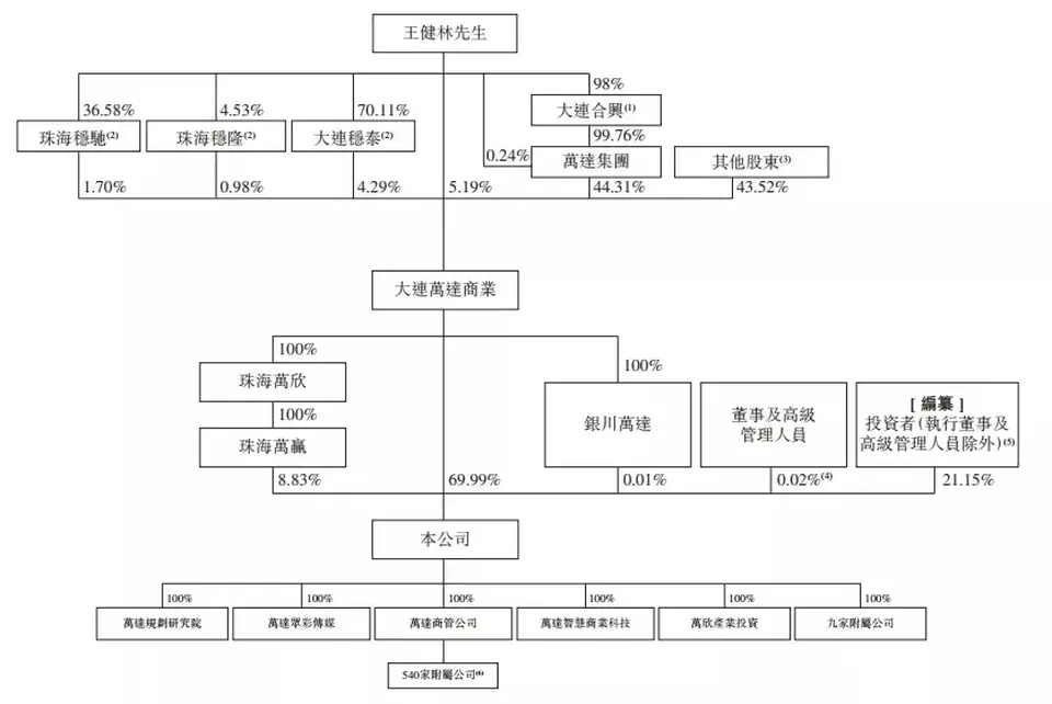 招股書顯示,截至最後實際可行日期,大連萬達商業、珠海萬贏、銀川萬達分別持有珠海萬達商管69.99%、8.83%、0.01%股權,而大連萬達商業又透過珠海萬欣、珠海萬贏及銀川萬達間接擁有已發行股份總數約8.84%的股權。騰訊、螞蟻、中信資本、星匠、合眾人壽、碧桂園服務、鄭裕彤家族、PAG等投資者合計持有21.17%股權。