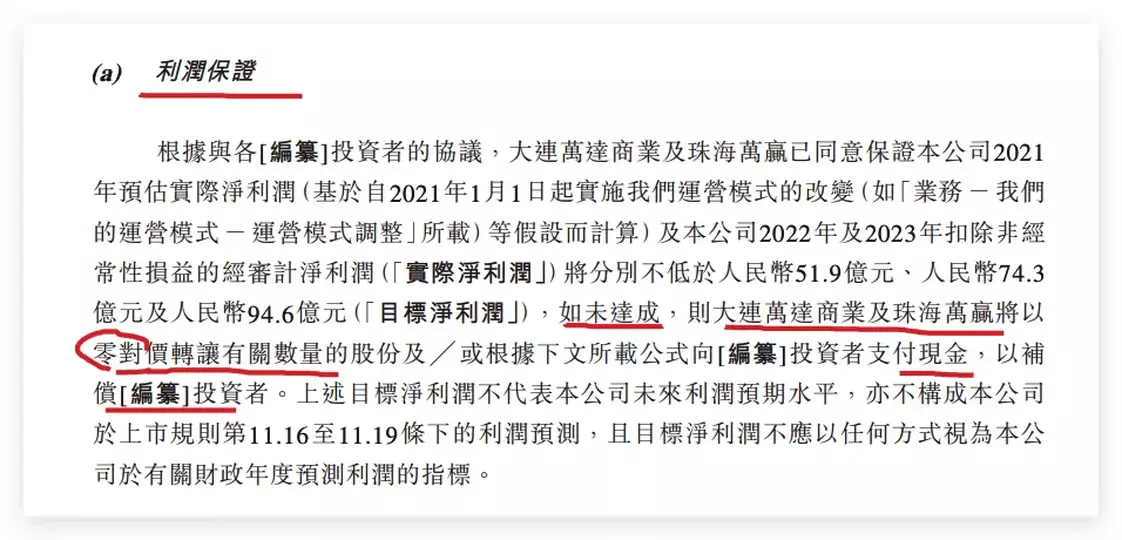 值得注意的是,招股書中披露,大連萬達商業及珠海萬贏與投資者設立了對賭協議。根據投資者協議,萬達商管2021年預估實際淨利潤以及2022年、2023年扣除非經常性損益的淨利潤須分別不低於51.9億元、74.3億元、94.6億元。