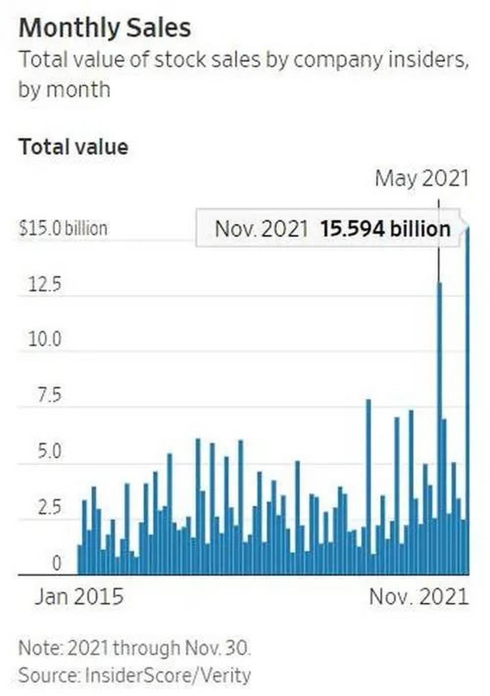 InsiderScore數據顯示,截至11月,企業內部人士出售了令人難以置信的635億美元股票,與2020年全年相比增長了50%。