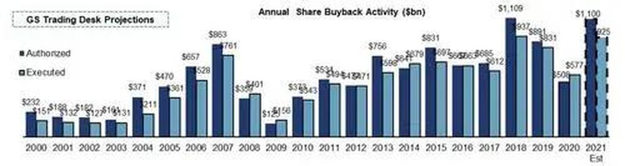 高盛指出,今年已經執行的股票回購數量驚人,在8850至9250億美元之間,而去年只有5770億美元。這表明內部人士正在二級市場上向他們自己的公司傾銷股票。