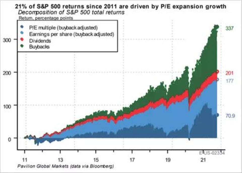 如果不是股票回購,企業內部人士永遠無法輕易在估值較高的水平拋售股票。彭博社援引研究機構pavilion global market數據顯示,當前牛市中的40%完全是因為回購。