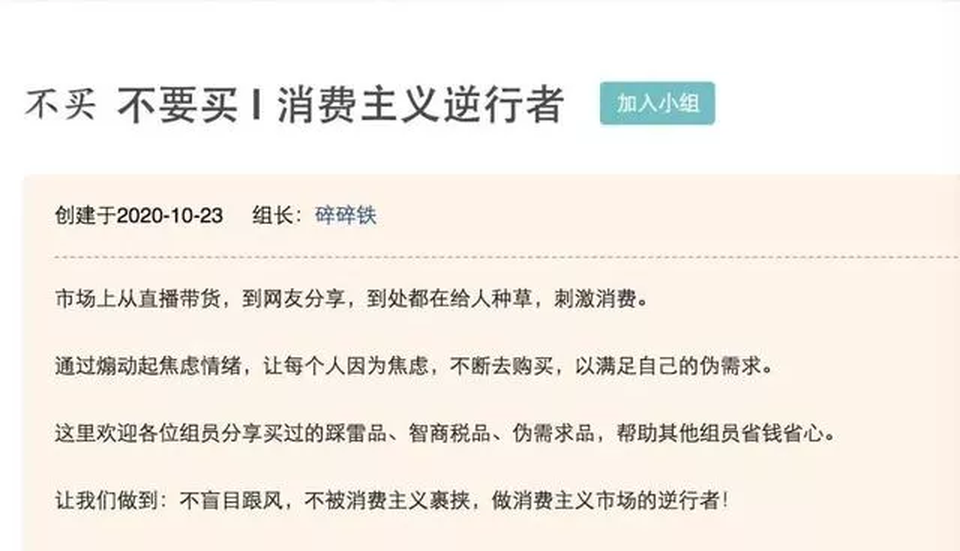 今年「雙十一」前後,有30餘萬組員的豆瓣「不要買丨消費主義逆行者」小組被眾多主流媒體報道,組內發帖主題大多是「不要買xxxx」,在全網鋪天蓋地的「買買買」氛圍中像一股清流。