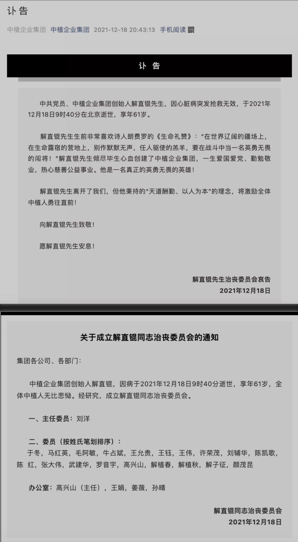 12月18日晚20時,中植企業集團官方微信發布訃告:中植企業集團創始人解直錕先生,因心臟病突發搶救無效,於18日9時在北京逝世,享年61歲。