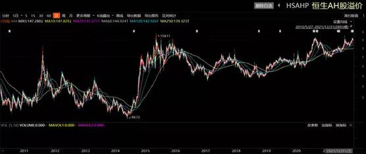 近十年AH股溢價最高點是2015年的「大水牛」時的154%,那時是A股漲太多了,而這一次是港股太「熊」了。
