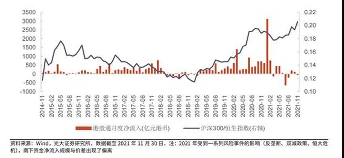 而A股與全球資本主要是通過「港股通」的渠道,基本是一個獨立而封閉的市場,可以看成是單獨配置,受全球資金流動影響較小,所以全球化資本減少港股配置的同時,北上資金並沒有受影響——或者說暫時未受影響。