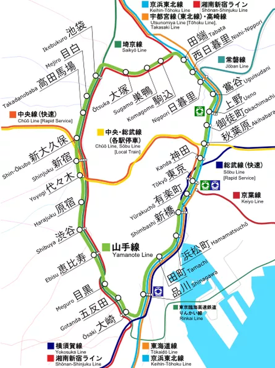 大部分鐵路進入東京會平行繞圈,圍繞環線(JR山手線)分佈。而東京所有火車站,也是世界上客流量最大的幾座火車站東京、新宿、涉谷、池袋、上野、品川等,均分佈在這個環上。