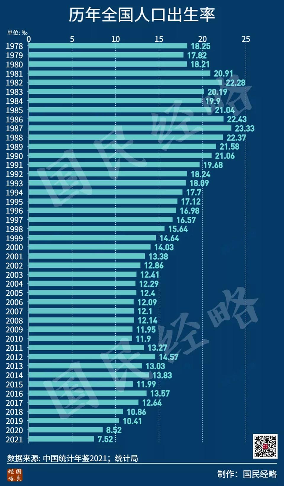 同時,人口出生率從8.52‰降到7.52‰,直落1個千分點。