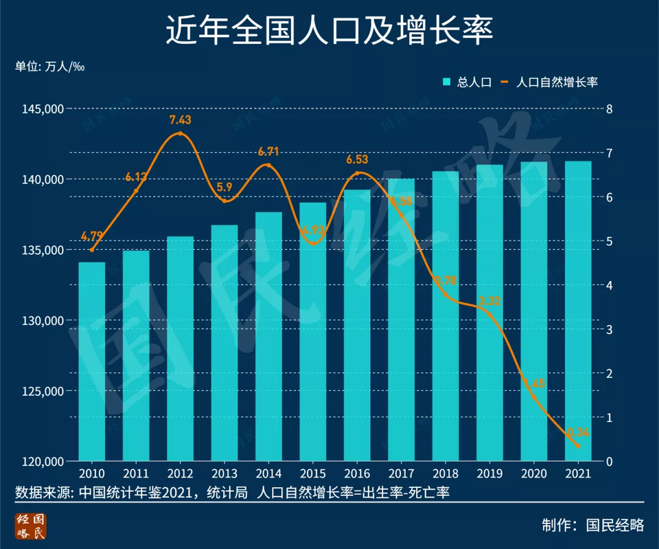 數據顯示,2021年,全國人口自然增長率僅為0.34‰,而前一年還是1.45‰,更早之前的2012年則高達7.43‰。