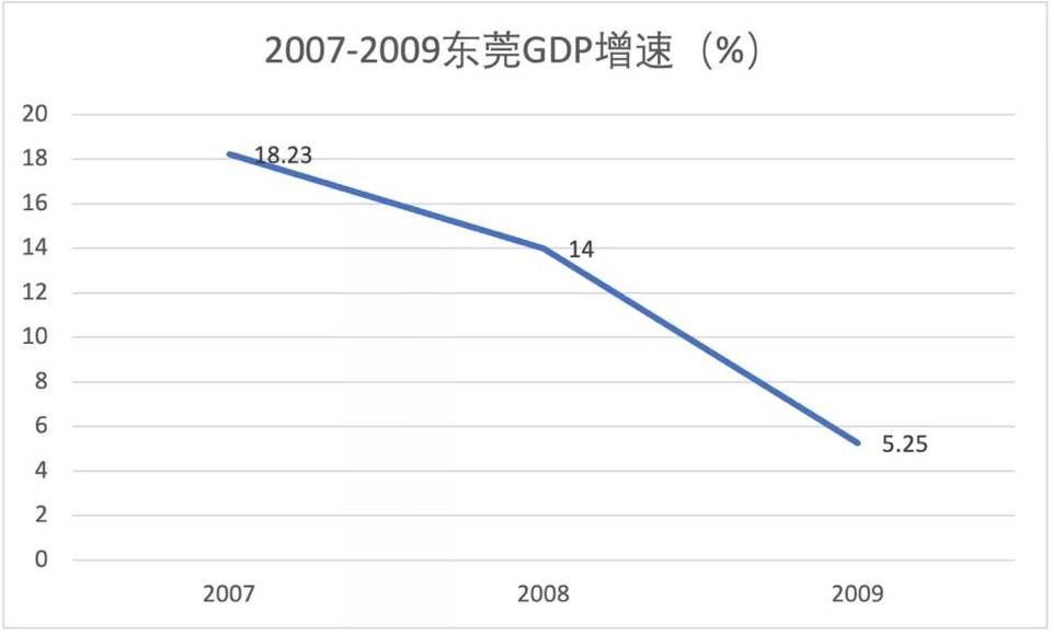 2008年全球金融危機爆發。外部環境的驟然變化讓「只有土地屬於自己」的東莞措手不及。2009年,東莞GDP增速驟降至5.25%;規上工業總產值比上年下降6.3%。
