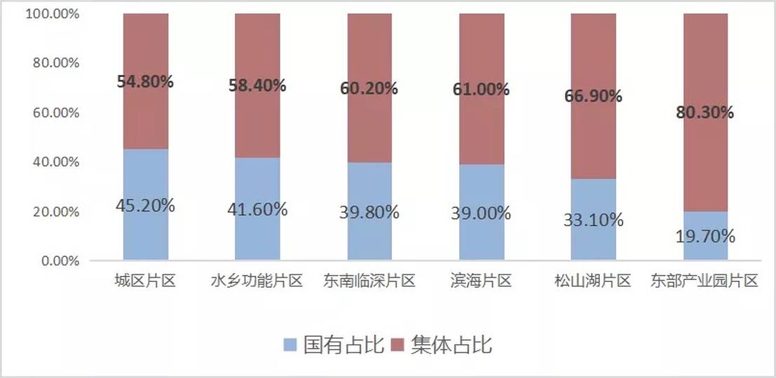 根據上圖可以看到,東莞各大片區土地權益絕大部份為集體所有,東部產業片區集體佔比超過八成,這直接導致東莞土地收儲完成率的低下。