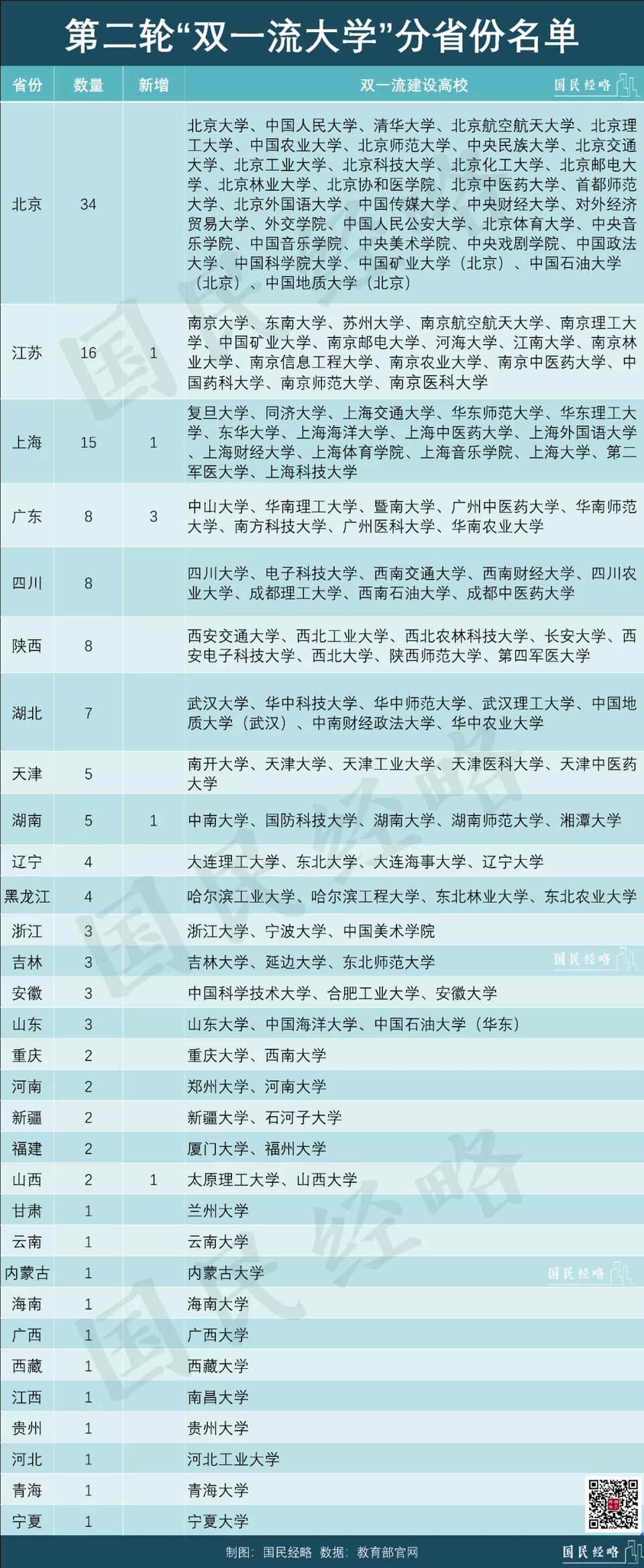 這是第二輪雙一流高校分省份分佈: