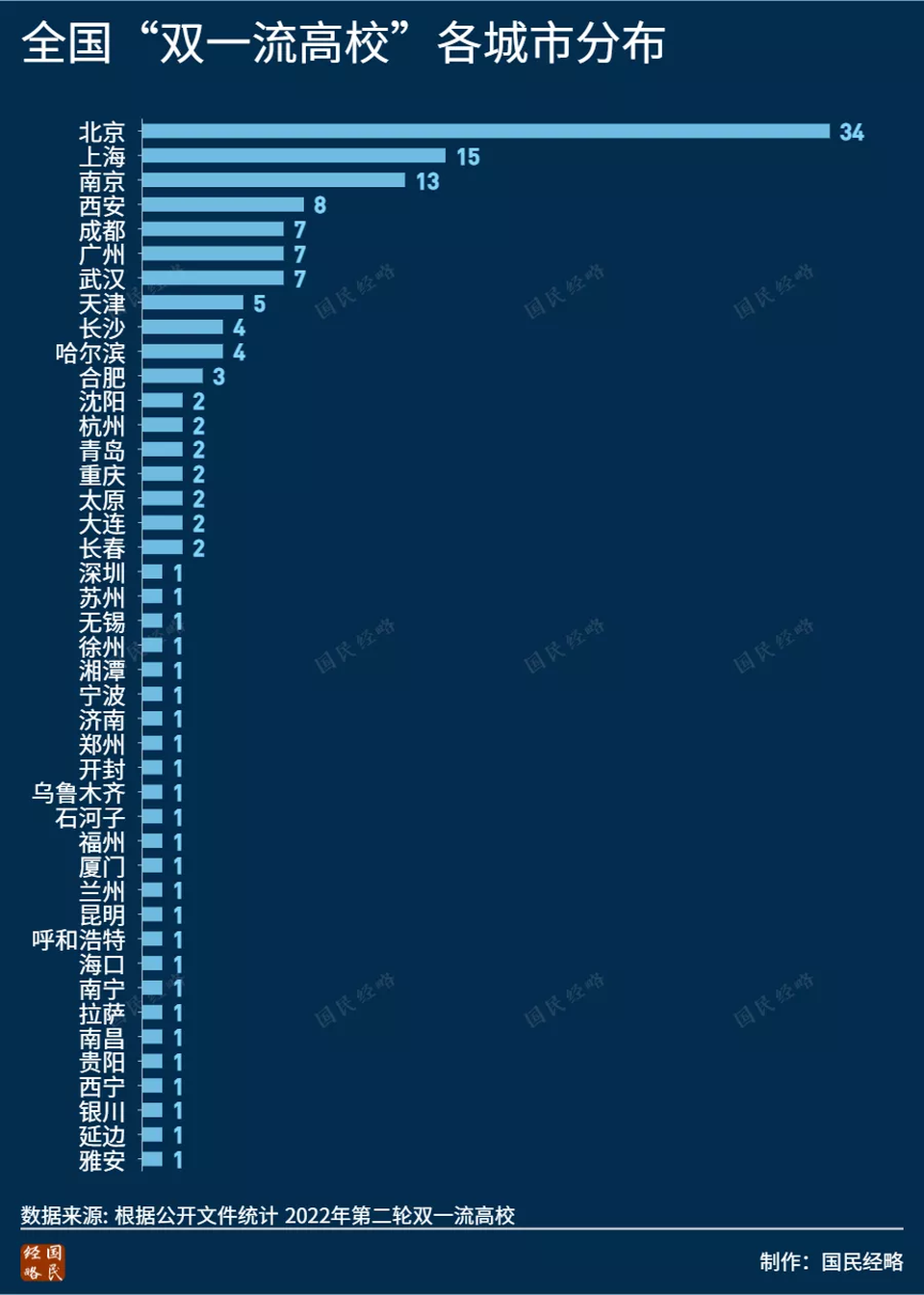北京(34所)、上海(15所)、南京(13所)、西安(8所)、廣州(7所)、成都(7所)、武漢(7所)、天津(5所)、長沙(4所)、哈爾濱(4所)。值得一提的是,藉助於南方科技大學的上榜,深圳終於告別「雙一流高校」掛零的歷史。