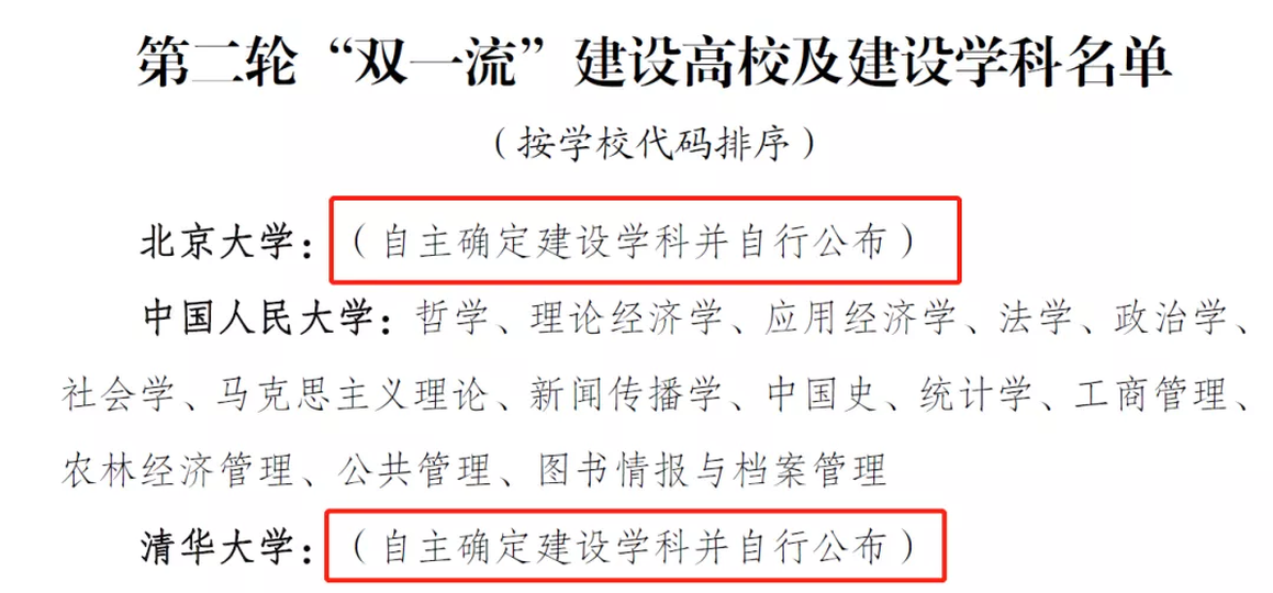 北大和清華並未公布一流學科名單,而是賦予了「自主確定建設學科並自行公布」的資格。