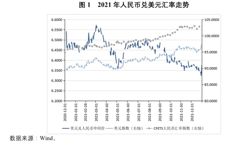 2021年人民幣匯率呈現強勢升值態勢。人民幣兑美元匯率中間價由6.5249上升至6.3757,升值了2.3%;人民幣兑CFETS貨幣籃子指數由94.84上升為102.47,升值了8%。(圖1)。