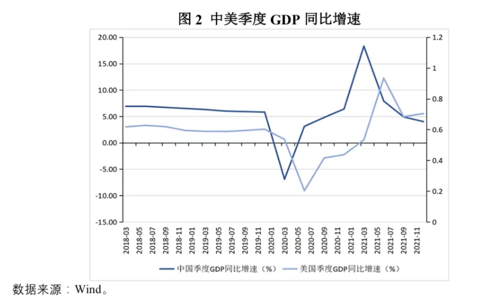 在經濟增長方面,中美經濟增速的差距已經顯著縮小。2021年美國GDP增速為5.7%,中國GDP增速為8.1%。2022年1月,IMF將美國2022年GDP增速從5.2%下調至4%,這主要是考慮到美國國會通過「重建美好未來」法案一攬子財政措施的可能性下降,當局更早退出非常規寬鬆貨幣政策,以及經濟面臨持續的供給擾動。同時,考慮到中國房地產部門持續收縮,且私人消費的復甦弱於預期,IMF將中國2022年的GDP增速從5.6%下調至4.8%。從季度GDP增速來看,2021年美國季度GDP按年增速分別為0.5%、12.2%、4.9%和5.5%;中國季度GDP按年增速分別為18.3%、7.9%、4.9%和4.0%。2021年二季度與四季度,美國經濟增速已經超過中國(圖2)。