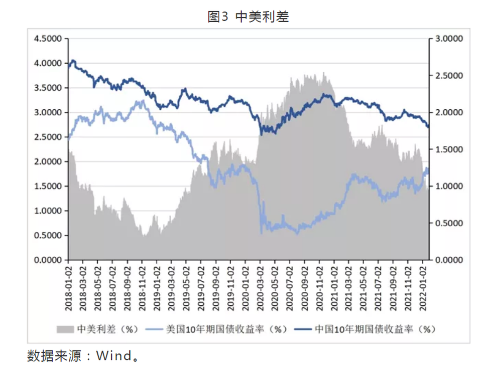 與美債收益率上行形成鮮明對比的是,10年期中國國債收益率在2021年呈現波動中下降的趨勢。2021年1月4日至2021年12月31日,10年期中國國債收益率從3.1713%下降至2.8352%,下降了33個基點。同期中美10年期國債收益率利差從2.2413%收窄至1.3152% (圖3)。伴隨着中國央行在2021年12月以來的加息節奏,10年期中國國債收益率在2022年1月25日更是一度降至2.6938%。中美利差縮小會影響到短期跨境資本流動,進而影響人民幣匯率交易需求,從而影響到人民幣匯率走勢。短期來看,中國會面臨一定的資本外流的壓力。