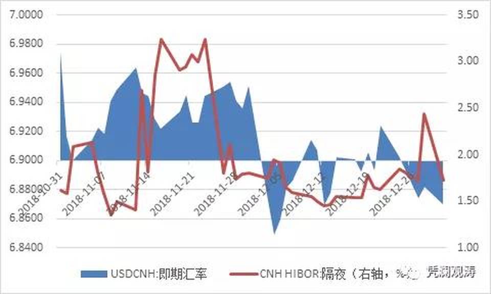 從外匯市場看,發行央票消息宣佈的次日(11月1日),CNH由上日的6.9742跳升至6.9170,11月2日進一步升至6.9002(這還受到頭晚中美兩國元首通話的影響),兩天累計升幅達1.1%。此後連跌兩天,到11月7日完成央票發行當日,收在6.9181,強於上日6.9228的水平,較10月31日累計上漲了0.8%。但央票發行結束的第二天(11月8日),又跌至6.9408。此後,CNH有漲有跌,直到受12月1日中美兩國元首會晤消息的提振,12月3日重新升破6.90(見圖2)。
