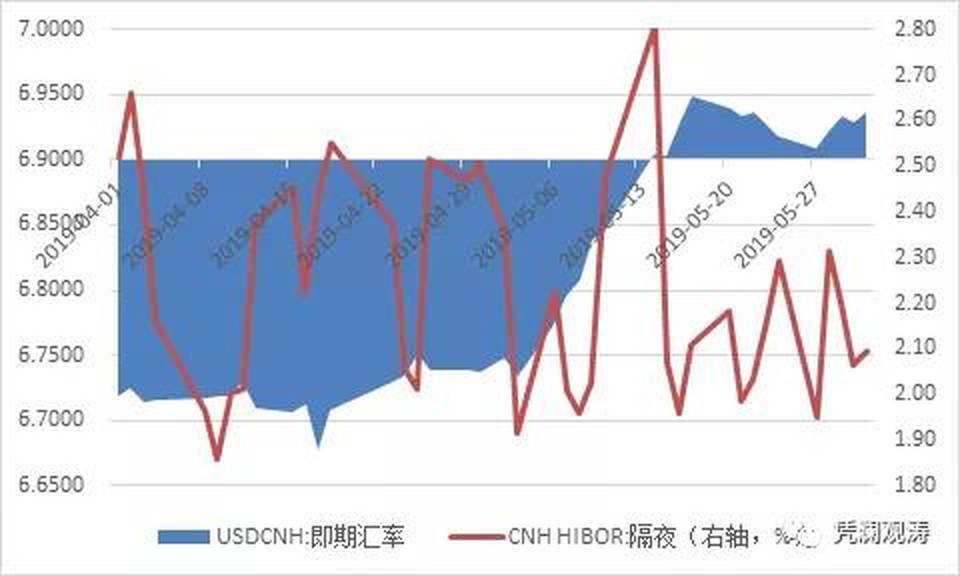 因美方對2000億中國進口商品加徵關稅提高到25%,以及對華為公司實施出口禁運,中美經貿談判陷入僵局,5月初以來境內外人民幣匯率快速下行,CNH與CNY分別於5月13和17日跌破6.90。市場上第三次掀起守7還是破7之爭。顯然,本次宣佈央票發行時,境外做空人民幣力量並不強大,應該主要還是基於3個月期限央票到期,滾動發行、借新還舊的考慮。