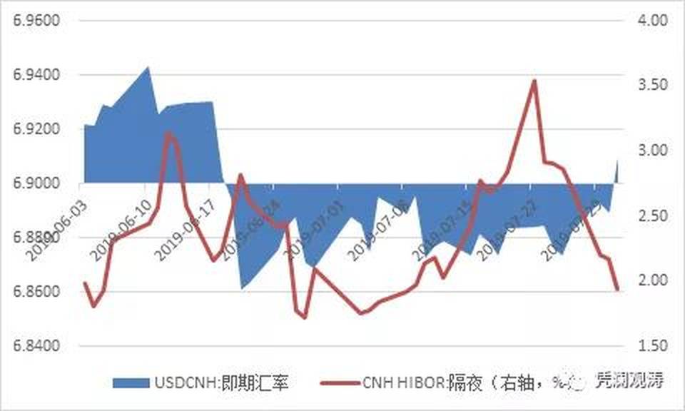從外匯市場看,發行央票消息宣佈的當日(6月19日),CNH為6.8944比1,略強於上日的6.9025,再次升破了6.90。但是,這可能不完全是該消息的影響,因為頭晚中美兩國元首再次通話,約定月底G20大阪峰會上會晤,顯然也有提振市場信心的作用。6月26日結束髮行當日,CNH收在6.8880,略強於上日的6.8843,較19日累計上漲了0.1%。此後,CNH一路升值,到7月1日升至6.8577,這是8月初CNH破7之前的高點(見圖5)。然而,這波短暫的升值行情還可能受益於6月29日中美兩國元首大阪會晤後重啟經貿磋商。