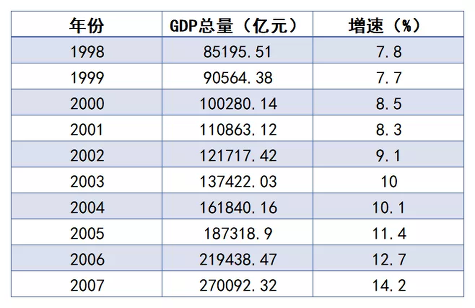房改釋放的活力一發不可收,房地產進入了高速發展期。在房地產經濟的帶動下,中國不但迅速走出了金融風暴,還進入了黃金髮展時期。1998年到2007年間,中國的GDP增速從7.8%,逐年提升至14.2%,增速越來越快。