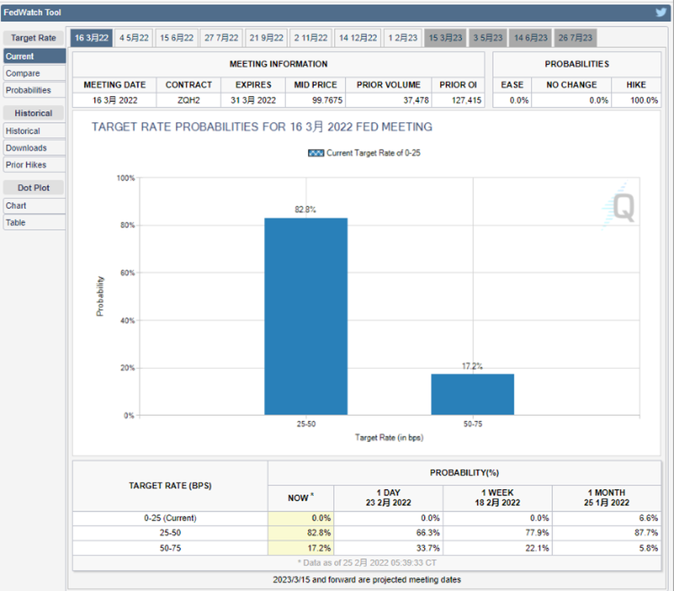 美聯儲政策預期方面,根據CME美聯儲觀察數據,由於俄羅斯對烏克蘭的攻擊所造成的經濟不確定性,美聯儲3月份將加息50個基點的可能性已經降低;最新數據顯示,美聯儲在3月份加息25個基點的概率為82.8%、加息50個基點的概率為17.2%。