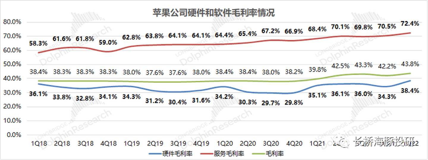 而蘋果直接反套路,毛利率不降反升,超出市場預期近2pct。這個背後是蘋果不僅是蘋果的「軟」實力還有「硬」實力: