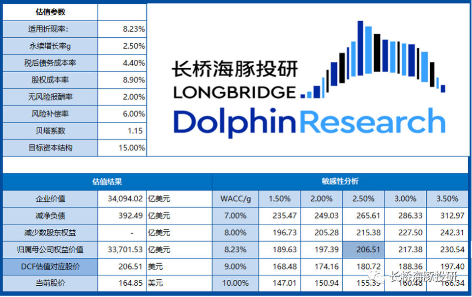更新模型後,按照2.5%的永續增長和8.23%的折現率,DCF估值206美元/股,較當前股價溢價25%。