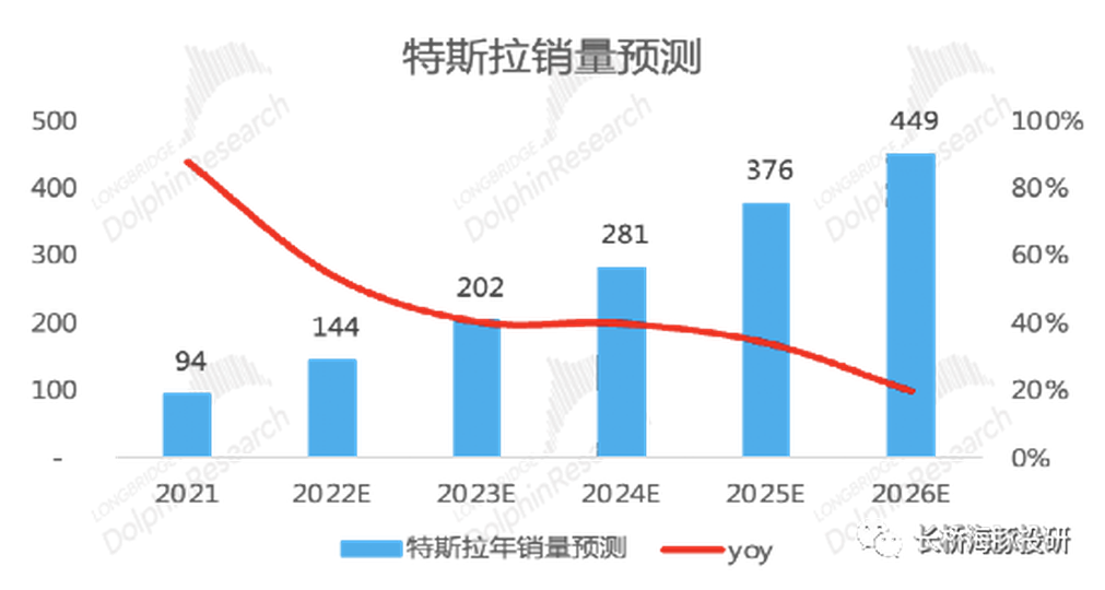 綜上,長橋海豚君預測對銷量的調整不大,預測2022年特斯拉銷量144萬輛(下調10萬輛),2026年假設全球新能源汽車滲透率25%,特斯拉銷量約450萬輛(下調20萬輛,5年複合增速37%),對應全球市佔率20%;