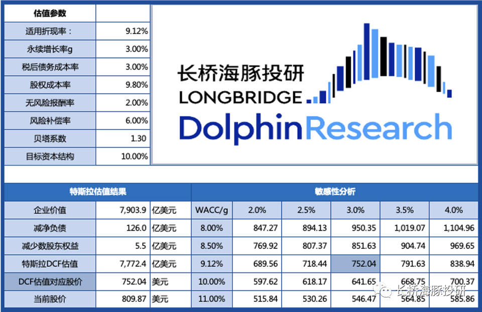 整體觀點,在銷量相對中性、盈利相對保守的核心假設下,特斯拉DCF估值約為7770億元,對應股價約750美元,較2022年2月27日收盤價815元還有7%的下降空間。
