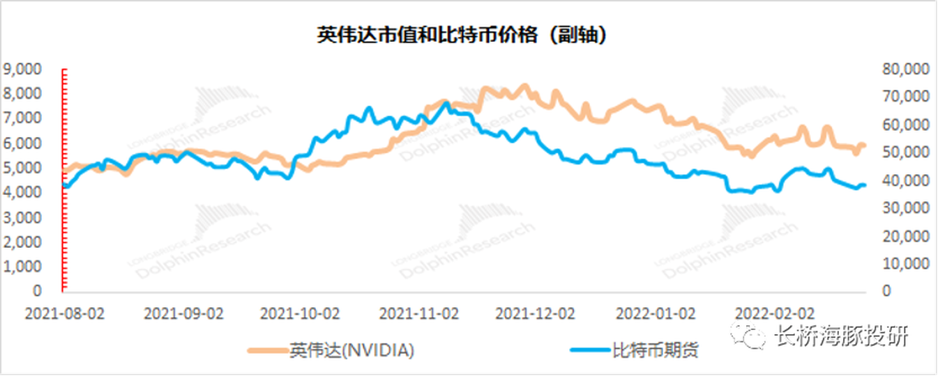 從近半年來英偉達公司和比特幣價格的走勢看,兩者存在一定的同漲/同跌趨勢。當比特幣價格上漲時,英偉達的股價也有拉昇動力。比特幣價格上漲,刺激挖礦需求,提升了市場對公司遊戲業務的預期。