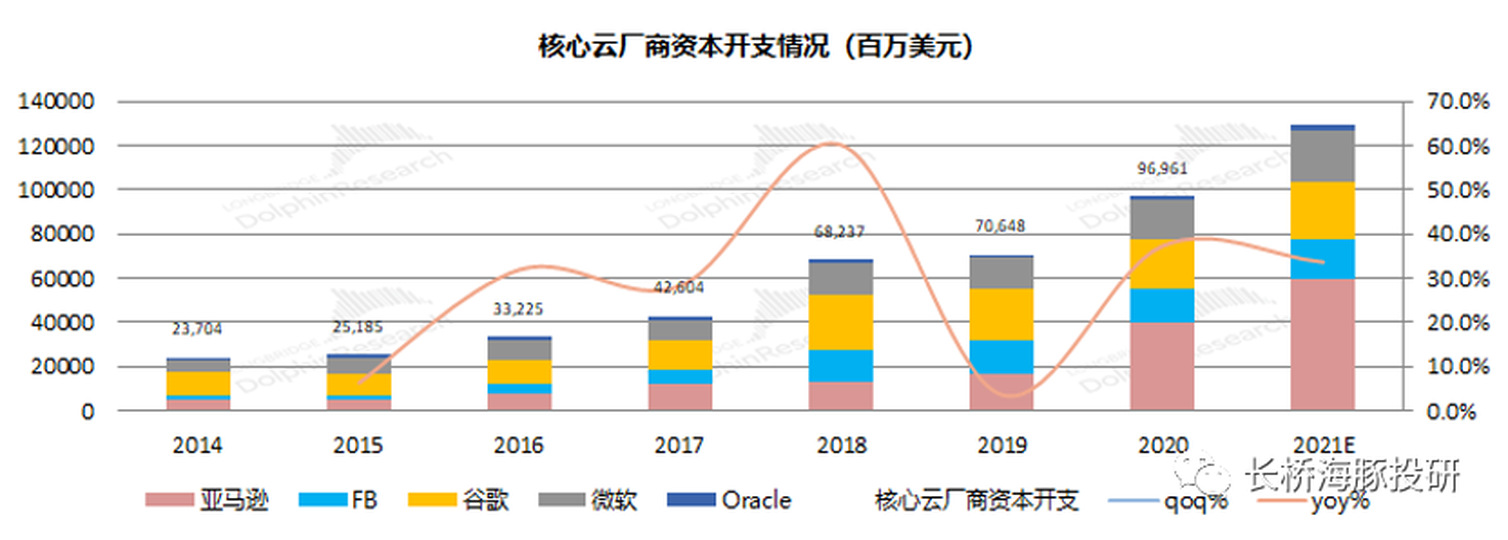 數據中心業務的下游主要是全球各大雲廠商,英偉達的高增長一部分來自於整個行業的高增長。海豚君統計全球各大核心雲廠商的資本開支情況,在疫情後總體呈現有增無減的態勢,在2020和2021年都有30%以上的增長,這為英偉達數據中心業務高增長奠定了行業面的基礎。