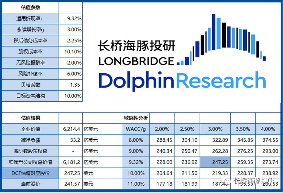 本次財報後,海豚君主要調增了英偉達遊戲業務和數據中心業務的增長預期,同時在市場加息預期下調高了折現率水平。更新模型後,按照3%的永續增長和9.32%的折現率,DCF估值247美元/股,與當前股價未見明顯溢價。