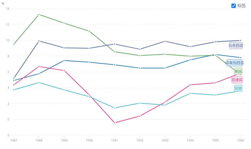 危機爆發前,「四小虎」們(泰國、馬來西亞、菲律賓和印度尼西亞)是經歷了經濟起飛的。像最先爆發危機的泰國,在危機爆發前的10年中,GDP增速曾一度高達13.29%,哪怕是菲律賓,危機前10年的平均水平也高於世界平均增速。