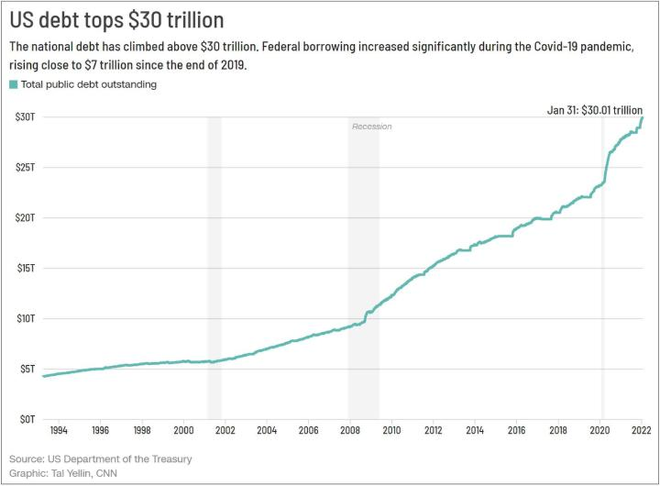 在加息之前,美國為了應對新冠疫情期,可謂是開閘泄洪般地放水。2019年2月,美債規模22萬億美元;而2022年2月1日,美國財政部公布美債已突破30萬億美元大關,平均每年增長10.89%.