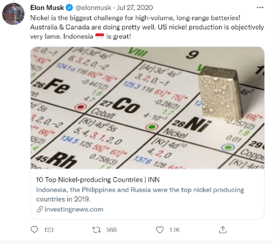 2019年,中國新能源汽車市場爆發。作為生產電動車三元鋰電池的重要材料,鎳礦成為了能夠"卡特斯拉脖子"的重要金屬。隨後,歐洲和美國也逐漸重視起汽車電動化趨勢,並計劃發展本土的動力電池產業鏈。