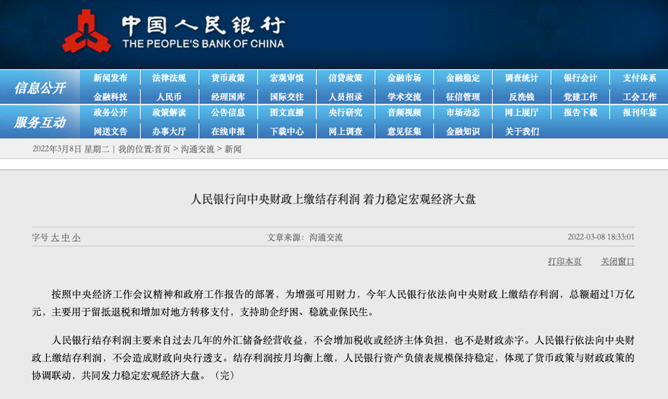 3月8日夜晚,中國人民銀行在官網發布公告,向中央財政上繳總額超過1萬億元的結存利潤,着力穩定宏觀經濟大盤!非常時期,非常舉措!