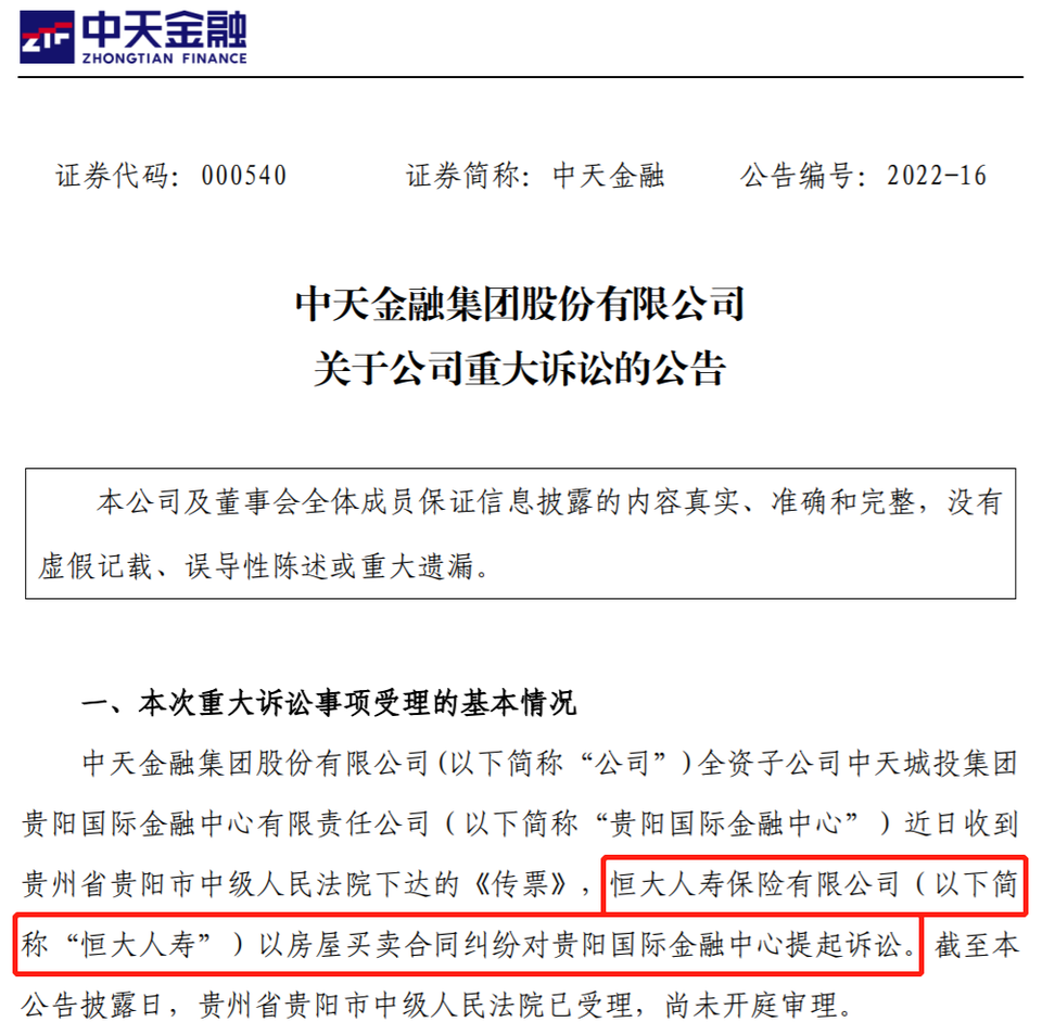 3月2日,中天金融發布,旗下全資子公司中天城投集團貴陽國際金融中心有限責任公司(簡稱「貴陽國際金融中心」),收到貴州省貴陽市中級人民法院下達的《傳票》。