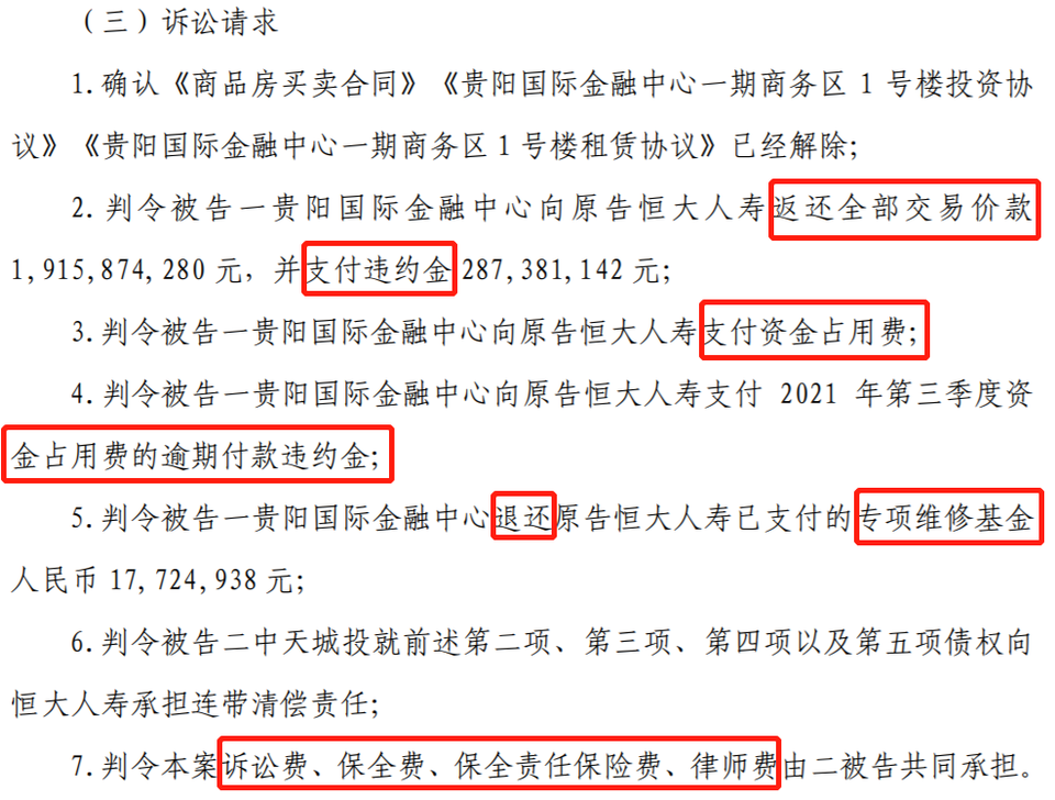 根據訴訟,恒大人壽提出7條請求,句句不離錢。
