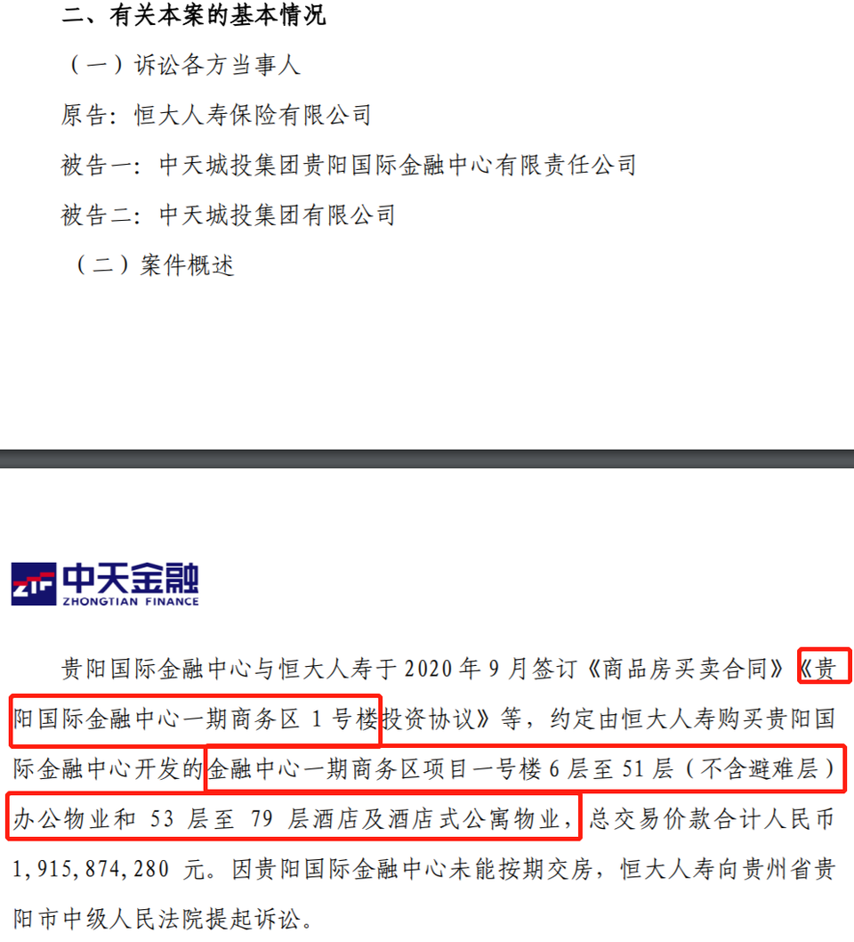 恒大人壽保險有限公司,以房屋買賣合同糾紛對貴陽國際金融中心提起訴訟。