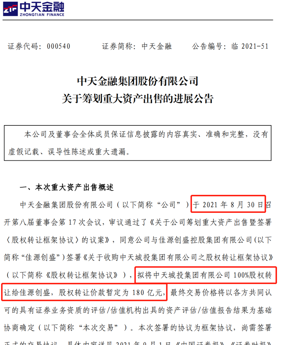 根據2021年8月底的公告,中天金融暫定以180億的轉讓價格,將中天城投100%的股權轉讓給佳源創盛,後者為浙江富商沈天晴的控股公司。