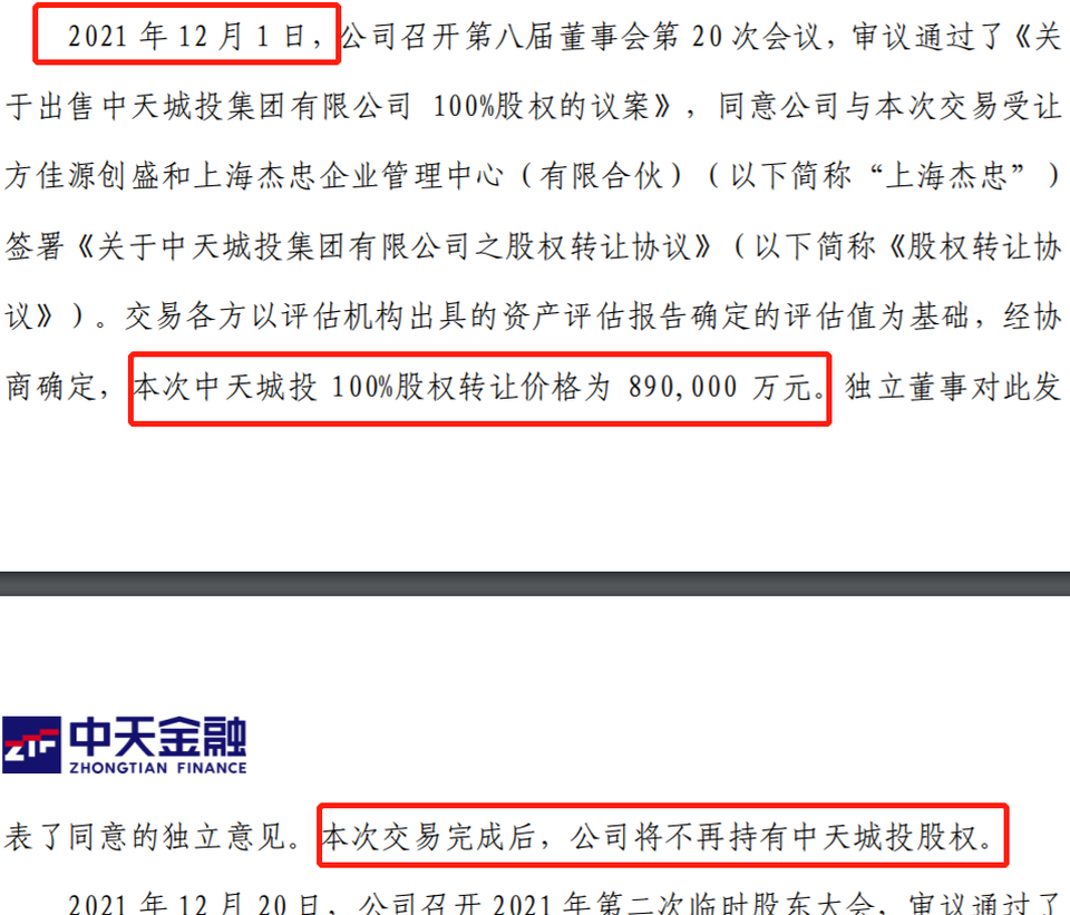 但三個月後,中天城投全部股權的轉讓價格變為89億元,直接腰斬。轉讓後,中天金融將不再持有中天城投的股份。