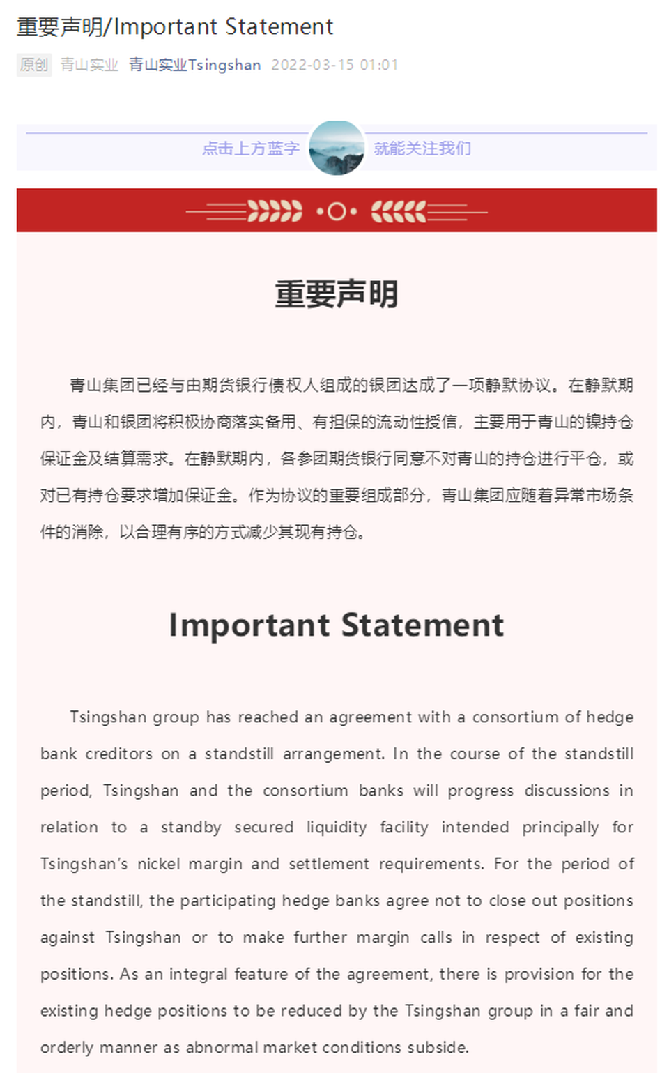 3月15日凌晨,倫敦金屬交易所(LME)「鎳逼倉事件」主角——青山集團,在公司微信公眾號上發表聲明,公司已經與由期貨銀行債權人組成的銀團達成了一項靜默協議。