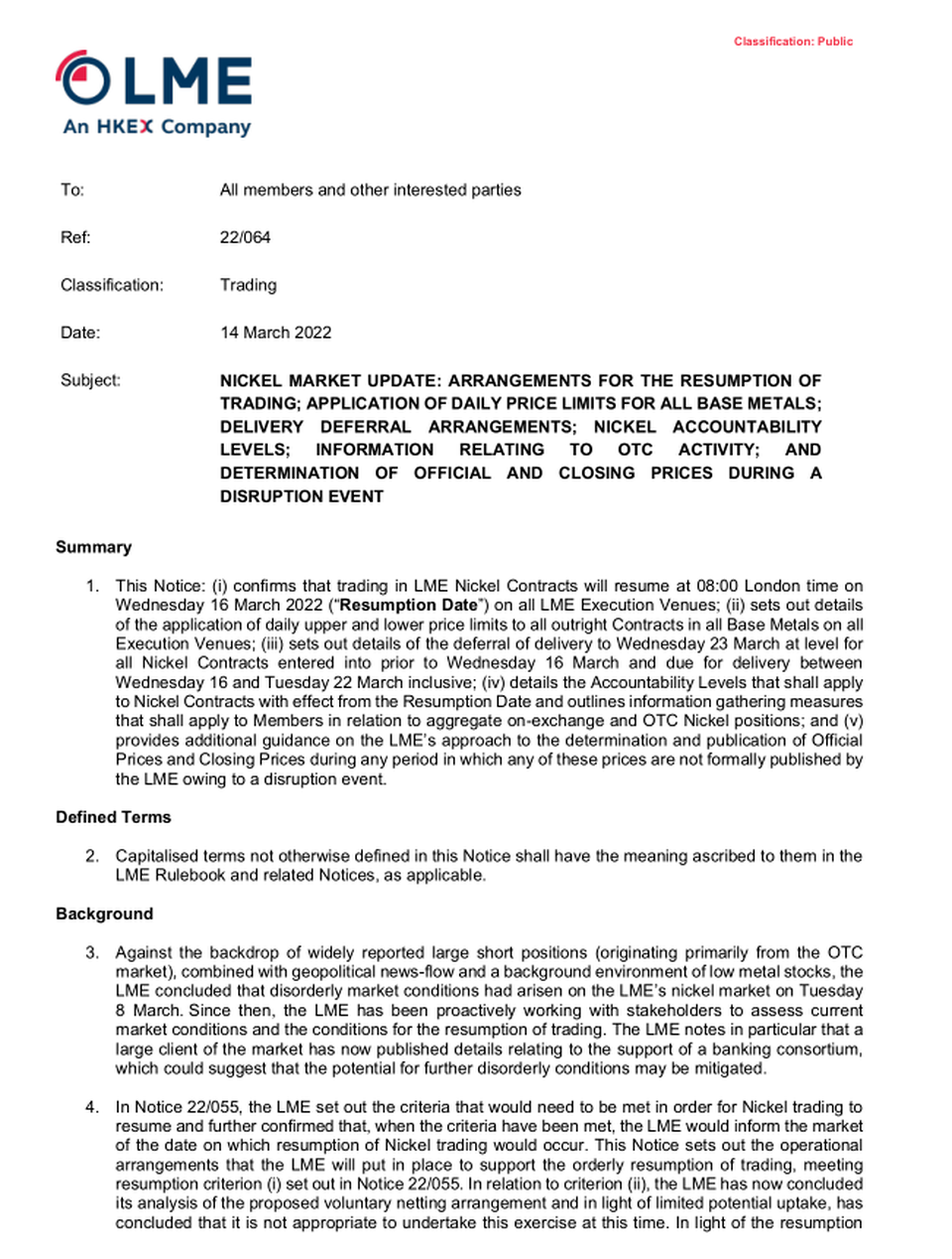 在暫停鎳市多日之後,倫敦時間3月14日,倫敦金屬交易所出台鎳市場交易新規。新規表示,在3月16日倫敦時間早8點,倫鎳恢復交易;倫敦金屬品種設置15%漲跌停板制度,其中鎳價格範圍設定自3月16日開始實施,具體漲跌幅度將在3月15日倫敦時間下午14:00 點前公布。
