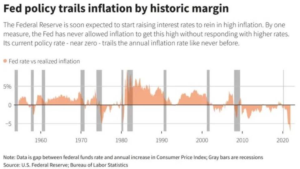 美聯儲幾乎肯定會在周三的政策會議上宣佈加息25個基點。但更重要的是利率「點陣圖」——政策制定者覺得今年、2023年和2024年需要加息多少,才能遏制通脹。通脹已經超出了他們的預期。