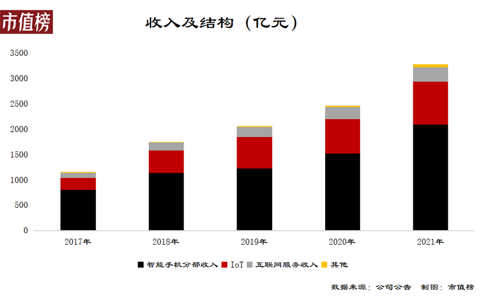 2021年全年,小米的營業收入為3283億元,按年增長33.5%,經調整淨利潤為220億元,按年增長 69.5%。