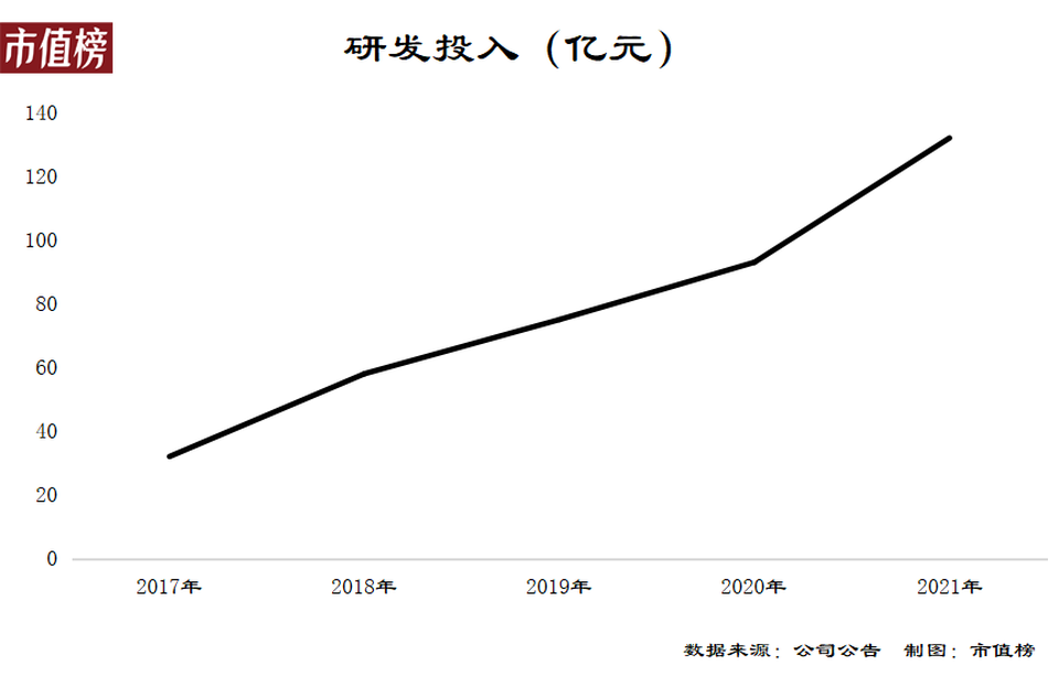 小米的研發投入從2017年的32億元增長到2021年的132億元,其中2021年按年增長42.3%,研發投入進入了中國高科技公司的前20位。