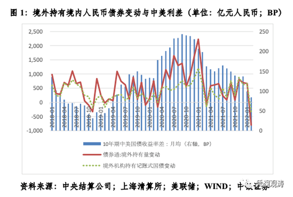 2月份,日均10年期中美國債收益率差為84BP,按月回落15BP,接近80~100BP所謂舒適區的下限。同期,境外淨減持境內人民幣債券803億元,其中淨減持人民幣國債354億元,二者均為史上單月淨減持最多。中外利差收斂僅能部分解釋境外減持人民幣債券的行為。如1月份日均10年期中美國債收益率差收窄38BP,境外仍淨增持人民幣債券662億元,儘管其按月和按年分別減少5%和70%(見圖1)。市場對於俄烏衝突引發的地緣政治風險外溢,應是主要誘因。