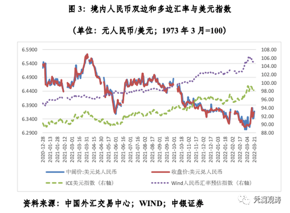 在美聯儲緊縮、俄烏衝突的背景下,人民幣匯率走勢堅挺。到3月10日,洲際交易所(ICE)美元指數較2月23日上漲2.4%,境內人民幣匯率中間價和下午四點半收盤價分別上漲0.3%和下跌0.1%,萬得人民幣匯率預估指數上漲3.2%(見圖3)。其間,人民幣匯率還刷新了2018年4月底以來的新高。人民幣一度被稱為「避險貨幣」。