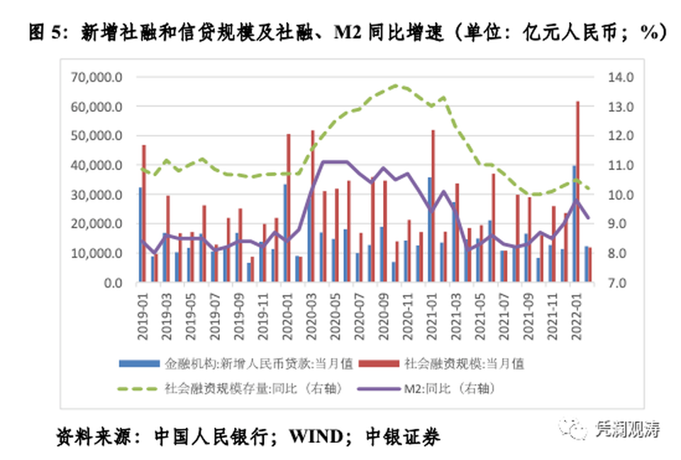 今年1月份,社融和貨幣信貸數據實現「開門紅」。但2月份,社融存量和M2分別按年增長10.2%和9.2%,增速分別按月回落0.3和0.6個百分點。相對應的,同期新增社融和人民幣貸款規模分別按年少增5343億和1300億元(見圖5)。最新社融和貨幣信貸數據重新走弱,引發了市場對央行再度降準降息的預期。不過,當月社融和貨幣信貸數據不及預期,並非緣於「緊貨幣」。