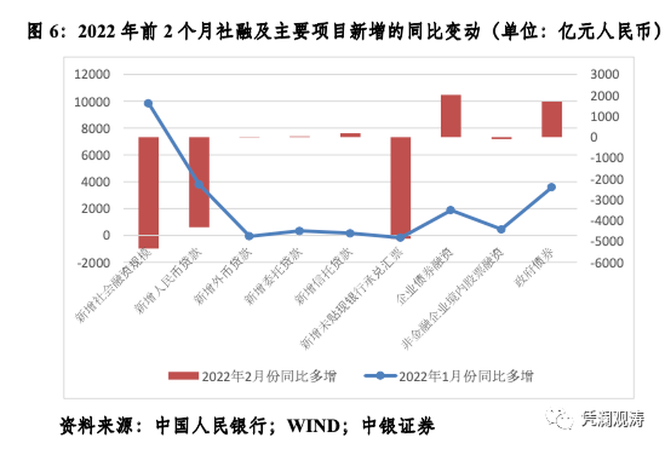 首先,從新增社融看,2月份,新增人民幣貸款和未貼現銀行承兑匯票分別按年少增4329億和4867億元,二者分別貢獻了新增社融按年少增的81%和91%。當期,企業債券融資和政府債券餘額分別多增2021億和1705億元(見圖6)。